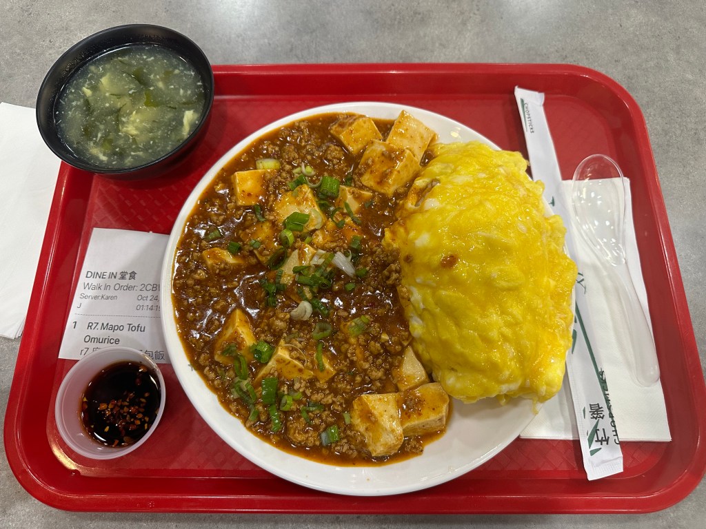 The H Mart in Carrollton sells almost anything. You can buy Kevin Malone’s foot bath, a stainless steel cookware set, live crab from a bucket, and grab a twenty minute back massage on the way out. However, what the Carrollton H Mart does not sell is Real 真饌 Taiwanese Cuisine’s mapo tofu omurice at their food court.