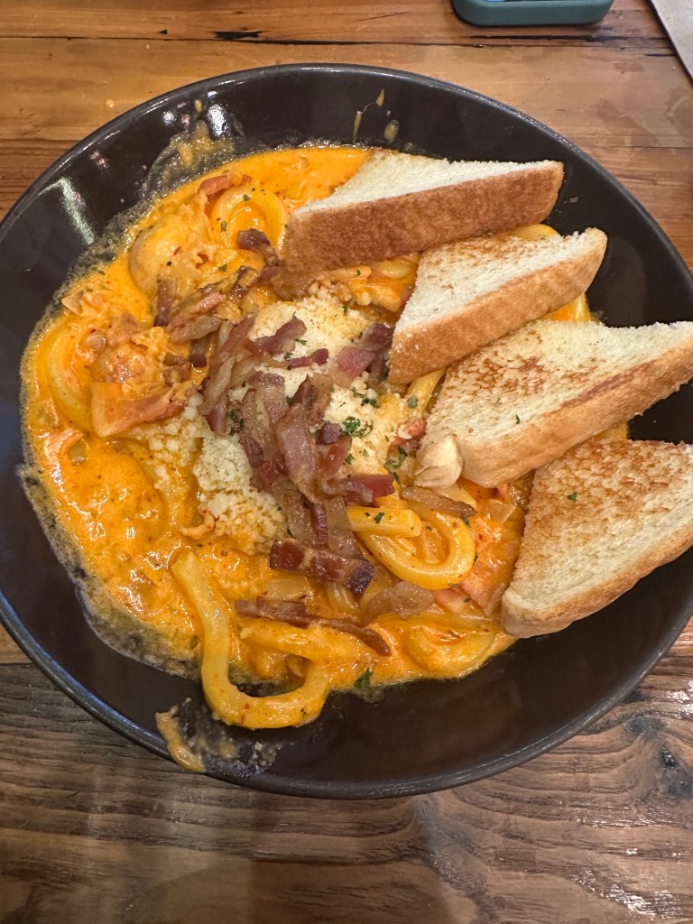 But, not even Korean brunch is safe from the fake potted plants, green foliage backdrops, neon signs, and cursive menus. I would be more amenable to overlook the Tik Tok drapery if there were more outlets scattered across the room to charge my 2015 MacBook Pro. Despite the frills, make sure to order the rose mushroom tteokbokki even if it is 11 AM (unless you have phobias of the words “moist” or “texture”). The pink sauce is thicker than normal tteokbokki due to the Italian forward tomato sauce and cream while the fish cakes are decadently chewy from presumed hours of infusion.